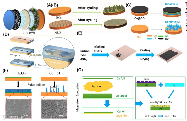 使用先进的成膜技术(例如真空热蒸镀,电子束蒸镀,脉冲沉积,直流/射频磁控溅射和化学气相沉积)在集流体上设计人工界面层可以极大改善AFLMBs的性能。然而,由于复杂的物理化学沉积或旋涂技术的经济可行性问题以及颗粒/溶剂的排放可能会造成环境污染,最终将影响AFLMBs的商业化过程。