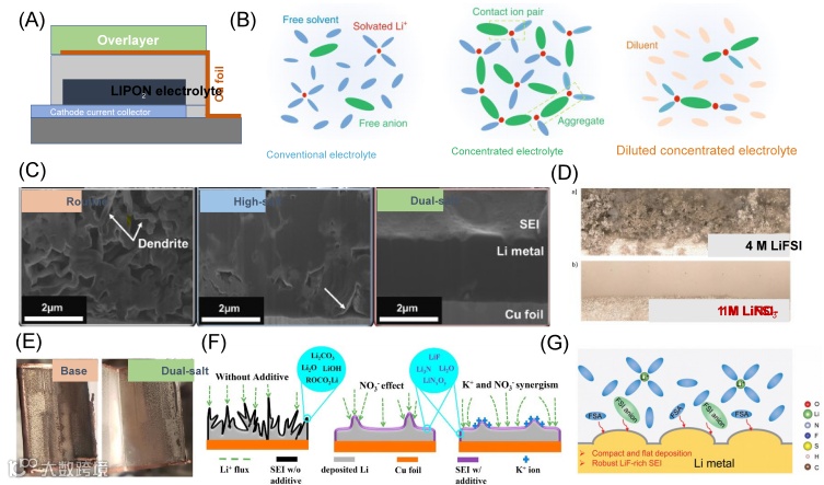 其中(3)电解质策略已占目前AFLMBs总发文量的43.8%,这也直接证明了电解质配方可作为先进AFLMBs研发中必不可少的部分,因为它在诱导稳定和坚固的电极/电解质界面,阻止寄生反应,减少活性锂和电解质的持续消耗,抑制锂枝晶生长方面具有重要意义,进而可以延长AFLMBs的循环寿命,实现高的电化学和热力学稳定性,最重要的是该策略与当前LIBs制造的现有设备具有良好的兼容性。