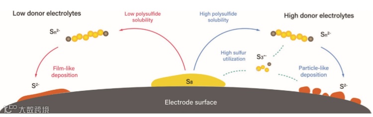 因此,锂硫(Li-S)电池引起了电池界的广泛关注,因为这些电池可以利用元素硫(1672 mAh g-1)的高理论容量提供高理论能量密度(2510 Wh kg-1或2800 Wh L-1)。在通过加氢脱硫净化天然气和石油的过程中,天然丰度和可承受性是作为供给过剩而非自动产生的。就锂化过程而言,元素S8的天然形式经历了一系列涉及各种多硫化物中间体的转化反应,其中一些能够溶解在电解液中。在完全锂化后,锂化硫转变为固态Li2S,完成了放电过程中的固态-液态-固态相变序列。具有讽刺意味的是,液态中间相的存在代表着一把双刃剑,由于液体中间相有利于电荷转移,因此具有多种动力学优势。另一方面,液体中间相是缩短循环寿命的主要原因,它促进了所谓的穿梭过程,液体中间相在电解液中溶解,然后扩散到锂金属(锂金属)对电极,在与锂金属电极发生反应后,最终返回硫电极。之前采用了两种主要策略,以尽量减少穿梭过程的不利影响,从而延长电池的循环寿命:消除多硫化物的溶解并稳定锂金属对电极。前一类的各种方法实现了优异的循环性能:将元素硫限制在多孔碳或碳纳米材料上,使用各种嵌硫聚合物,对分离器进行改性以阻止多硫化物的扩散,对多硫化物具有高亲和力的纳米材料的研究、可与多硫化物反应的材料的研究等。