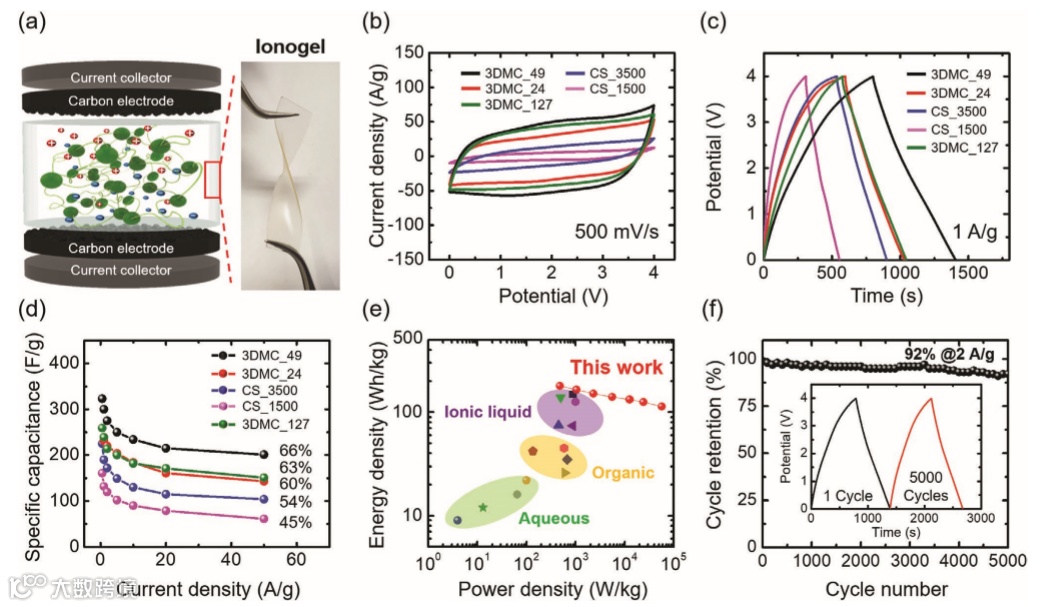 为了最大限度地提高实用性,并防止在挠性器件的重复弯曲过程中发生潜在的电解质泄漏,最好使用在目标离子液体中生成3D网络的宿主聚合物来固化离子液体。由此产生的固体聚合物凝胶电解质或离子凝胶,具有优异的物理特性,如高离子导电性、宽的工作电位窗口、非易失性和优异的机械灵活性,使其成为下一代轻质柔性超级电容器的理想固体电解质。此外,离子液体和离子凝胶还被广泛应用于充电电池、热电化学电池、气体分离、驱动器、传感器、神经形态器件、印刷电子和光电器件等领域。