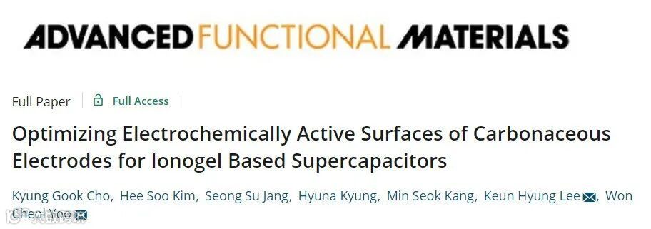 针对上述现象,汉阳大学的Won Cheol Yoo教授和仁荷大学Keun Hyung Lee等人在国际知名期刊Advanced Functional Materials上发表题为“Optimizing Electrochemically Active Surfaces of Carbonaceous Electrodes for Ionogel Based Supercapacitors”的文章。