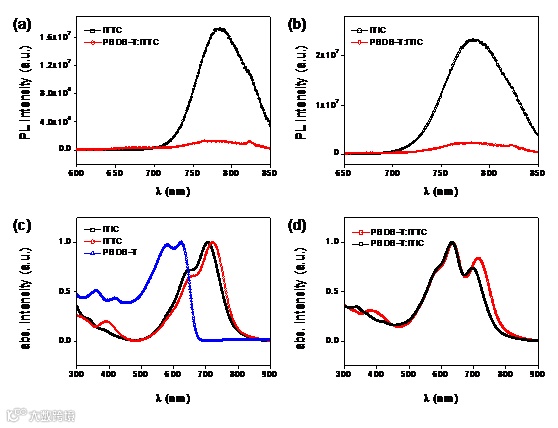 图2. 有机给受体及其混合薄膜的稳态荧光和吸收光谱图。