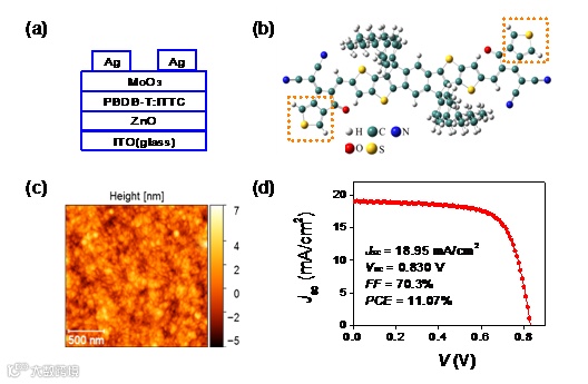 图1.非富勒烯有机太阳能电池的器件结构、薄膜表征及电学表征。