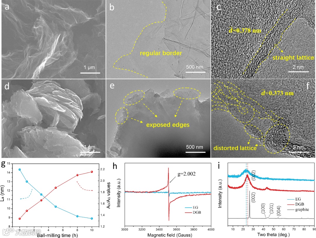 图1. 材料的形貌和结构对比:EG的(a)SEM,(b)TEM和(c)HRTEM照片;DGB的(d)SEM,(e)TEM和(f)HRTEM照片;(g)缺陷密度和sp2团簇尺寸随球磨时间的变化趋势;(h)EG和DGB的ESR谱图;(i)EG,DGB和石墨的XRD谱图。
