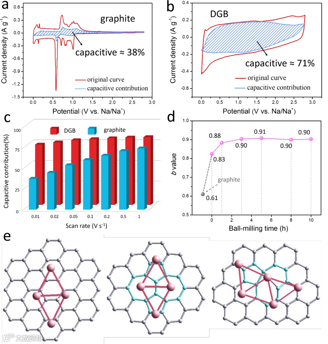 图3. 储钠行为和机理的研究:(a)石墨和(b)DGB在10 mV s-1扫速下的电容贡献比例;(c)电容贡献比随扫速的变化趋势;(d)b值随球磨时间的变化趋势;(e)完美石墨烯(左),S-W缺陷(中),单空位(右)结构的储钠模型。