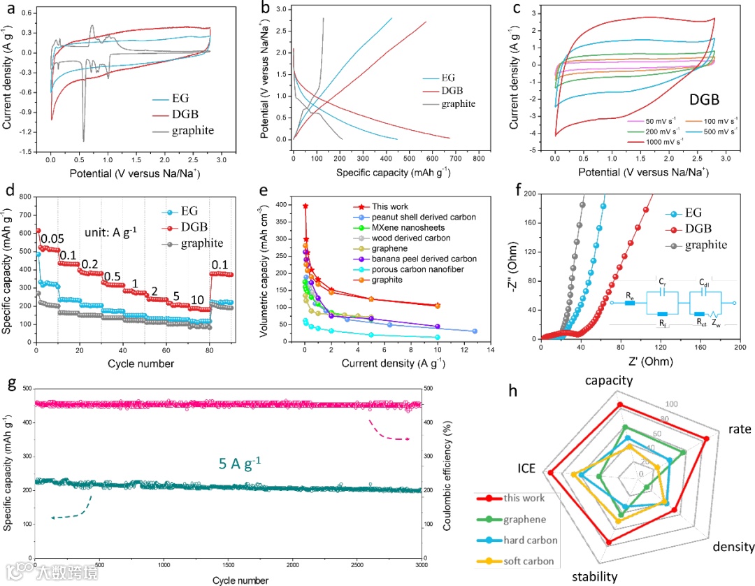 图2. 材料的储钠性能研究:EG,DGB和石墨的(a)CV曲线和(b)恒流充放电曲线;(c)DGB在不同扫速下的CV曲线;(d)EG,DGB和石墨的倍率性能;(e)DGB与其他炭材料倍率性能对比图;(f)EG,DGB和石墨的阻抗谱图;(g)DGB循环性能测试;(h)DGB与各类炭材料综合性能对比图。