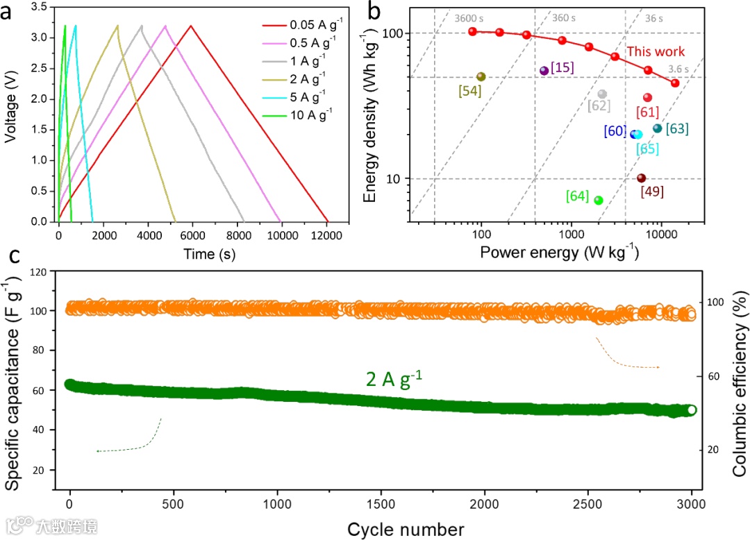 图4. 钠离子电容器的性能:(a)不同电流密度下的充放电曲线;(b)其他文献报道的锂/钠离子电容器能量和功率密度对比图;(c)循环性能测试。