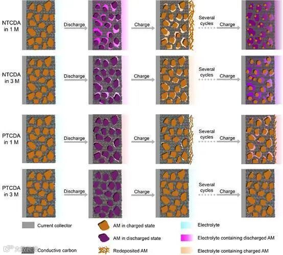 NTCDA和PTCDA电极在1 M和3 M电解液中的结构演变模型(AM = active material)。