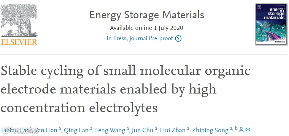 近日,武汉大学宋智平课题组在国际知名期刊Energy Storage Materials (2019 IF=16.28)上发表题为“Stable cycling of small molecular organic electrode materials enabled by high concentration electrolytes”的研究工作。