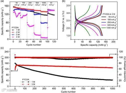 图1c,d和图3a显示,PTCDA在3 M和4 M电解液中的循环性能接近,但在4 M电解液中反应动力学非常迟缓。因此选择3 M作为最佳浓度与1 M电解液对比PTCDA在其中的长循环稳定性。