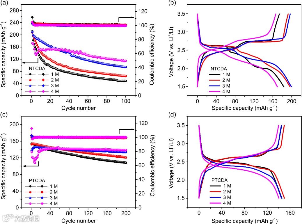 (a,b) NTCDA和(c,d)PTCDA在不同浓度LiTFSI/DOL+DME电解液(1,2,3和 4 M)中的循环性能和典型充放电曲线(50 mA g-1)。
