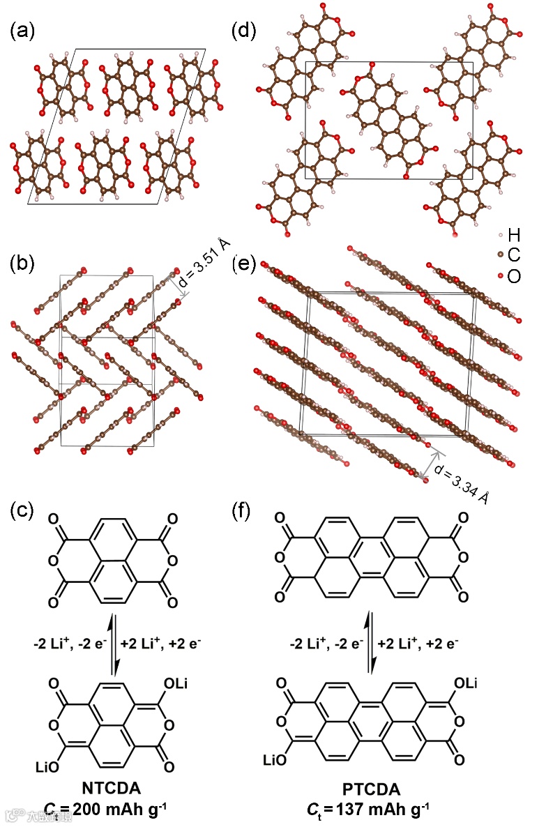 (a–c)NTCDA和(d–f)PTCDA的晶体结构和电化学反应机理。