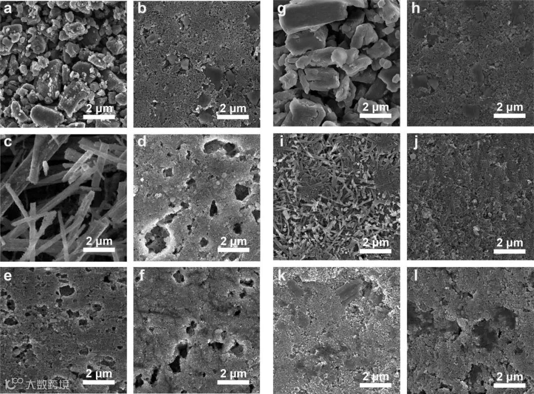 (a–f)NTCDA和(g–l)PTCDA粉末和不同循环周数下充电态电极的SEM图:
