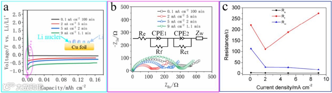 图1展示了不同电流密度下的电化学行为,从0.1 mA cm-2 到 9 mA cm-2, 电解液电阻保持不变。钝化膜电阻在0.1 mA cm-2时为220 Ω,在2 mA cm-2时电阻降低。从2 mA cm-2到9 mA cm-2范围内,电阻随电流密度线性变化。阻抗的变化可能是源于SEI组分和厚度的变化。