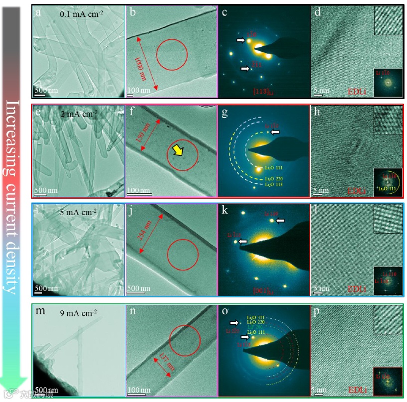 图3显示了电化学沉积的金属锂的结构,在低电流0.1 mA cm-2下,锂枝晶的直径有数百纳米,直径分布宽泛,单根锂枝晶以单晶形式存在。