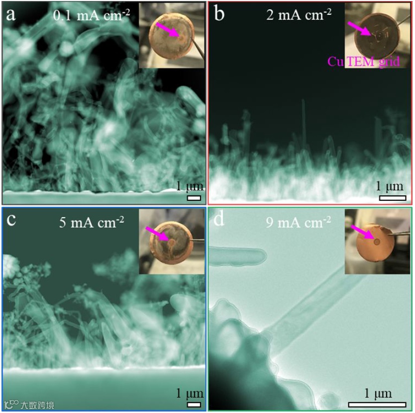 图2展示了电沉积金属锂形貌随电流的变化规律。在不同电流密度下,以枝晶形貌为主,但随着电流密度增加,枝晶的密度减小。在低电流密度下的高枝晶密度表明锂枝晶是生长控制模式,而大电流密度下的低枝晶密度表明锂枝晶是成核控制模式。