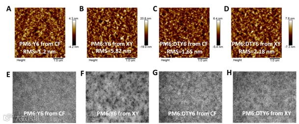 图2.不同溶剂加工的活性层薄膜的表面形貌和相分离