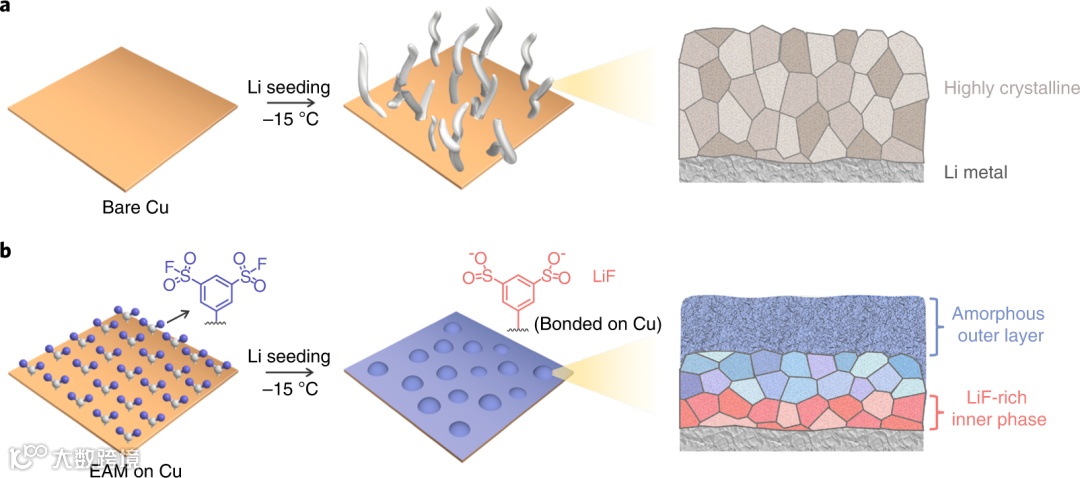 具体而言,本文报道了一种在低温下稳定锂金属负极的界面操纵方法。在这种方法中,SEI纳米结构和Li成核是由1,3-苯二磺酰氟化物在铜集流体表面的自组装单层膜调控的。这种电化学活性单分子层(EAM)在Li金属表面原位形成氟化锂(LiF)核,改变了界面化学环境。