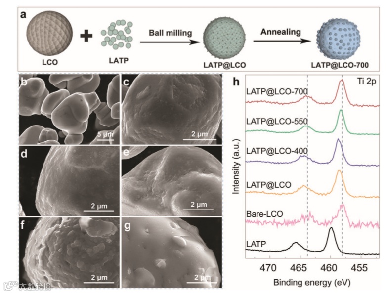 在这项工作中,作者开发了一种在LiCoO2表面构造具有适当锂导电性能的高压稳定层的方法。首先,通过机械混合方法将纳米级Li1.5Al0.5Ti1.5(PO4)3(LATP)微粒涂覆在微米级LiCoO2颗粒上。然后,通过高温退火,LATP与LiCoO2反应,将LiCoO2的表面转化为尖晶石Co3O4相,同时同时形成其他尖晶石相(类似CoAl2O4和Co2TiO4)和Li3PO4。