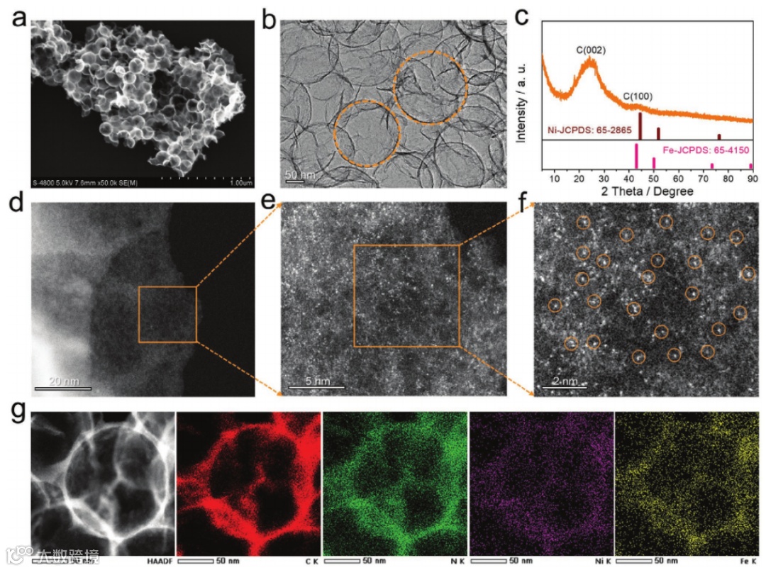 d–f) Aberration-corrected STEM images of Ni-N4/GHSs/Fe-N4.