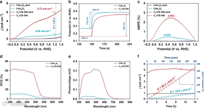本文报道了一种缺陷态三元金属硫化物(CdIn2S4)光阳极材料。通过引入表面硫空位显著提高了其光电化学性能。在模拟太阳光下,1.23 V(vs. RHE)时,具有5.73 mA cm-2的光电流密度,同时,在0.477 V(vs. RHE)偏压下光电转换效率为2.49%。