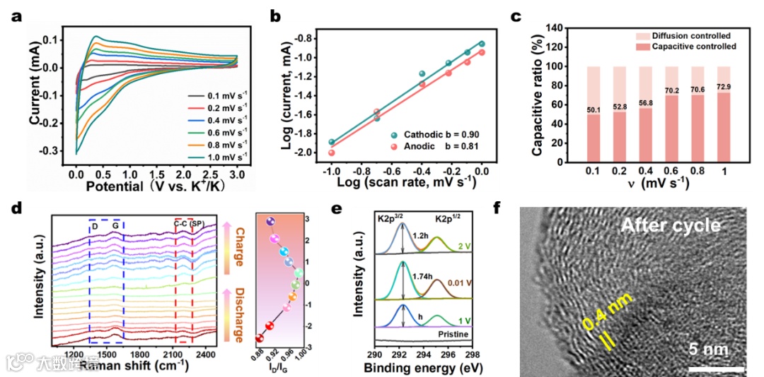 图3显示了石墨炔储钾时的动力学行为,并初步探索了储钾机制。通过不同扫速下的CV(图a)计算b值(图b)以及容量贡献(图c),发现实际容量受扩散控制和电容控制的共同作用;并且随着扫速的增大,电容控制占比提升。
