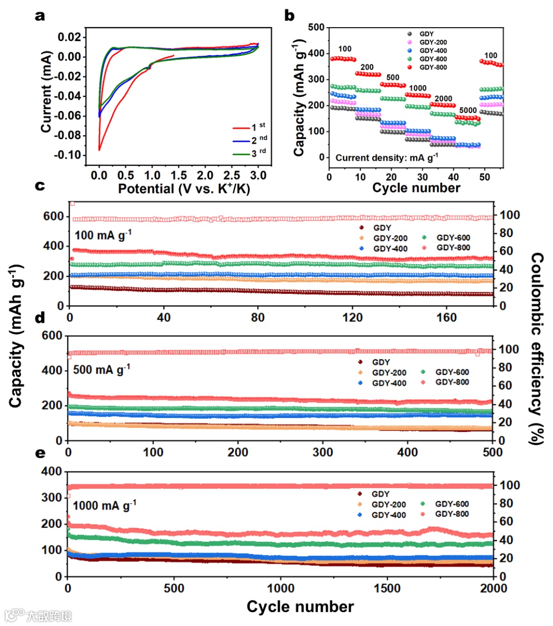 图2突出了温度调控对石墨炔储钾性能的优化作用。对石墨炔进行简单的退火处理,可减少其表面富集的含氧官能团,促进其离子/电子的传输,进而缓解了储钾过程中的体积膨胀。由图b可见,温度越高,导电性越好,钾离子存储的容量越高。不同电流密度下的长循环测试共同证实了GDY-800具有较为优异的电化学性能。