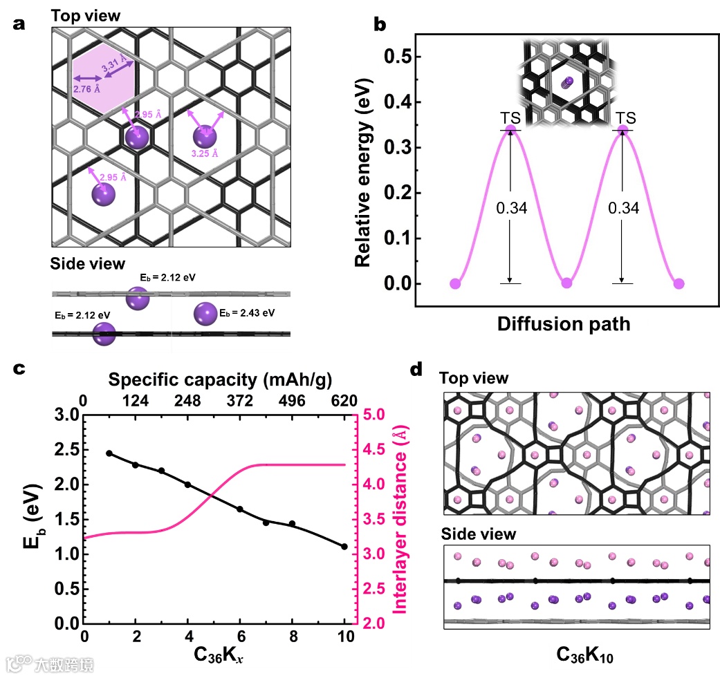 图1揭示了理论计算对石墨炔储钾的指导作用。石墨炔作为一种碳的同素异形体,具有大量的乙二炔键和均匀分布的“大三角”孔隙结构,使得钾离子不仅能够在层与层之间迁移,还能在层间垂直穿梭。