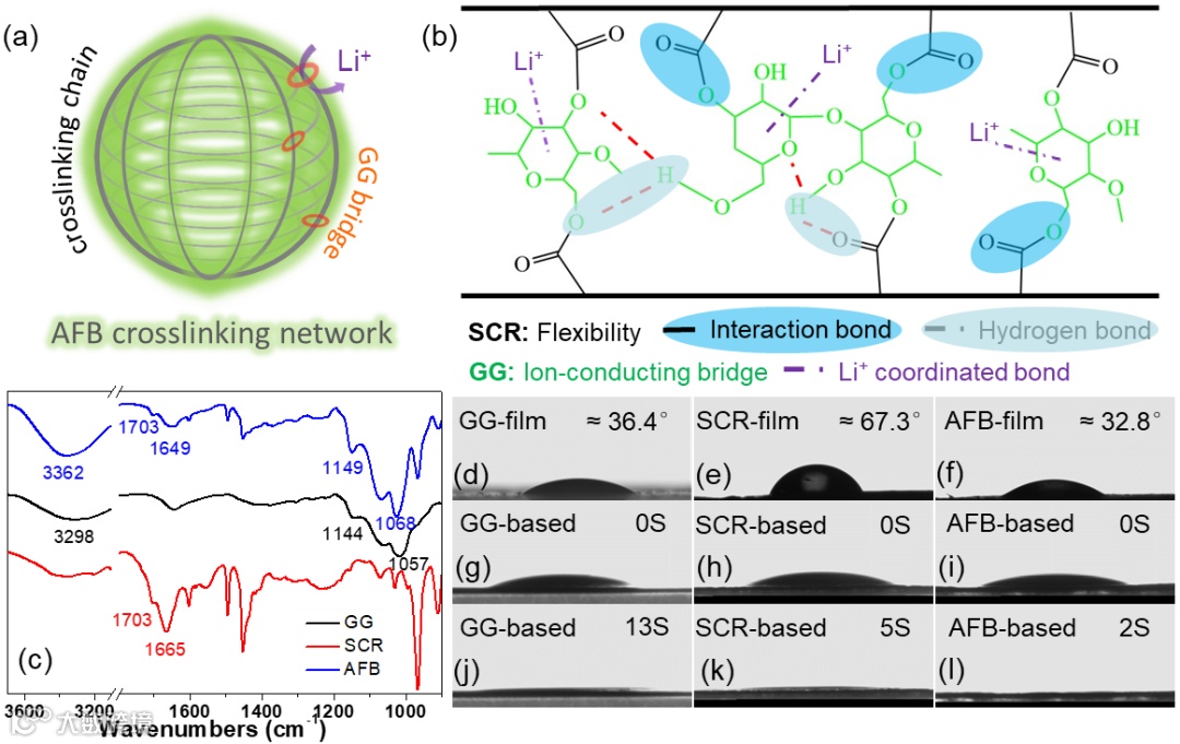 图1示例了AFB制备机理和交联网络结构示意图。并且,AFB粘结剂相对于其他常用粘结剂表现出更优异的电解液亲和性,AFB基正极也具有更好的电解液浸润性。