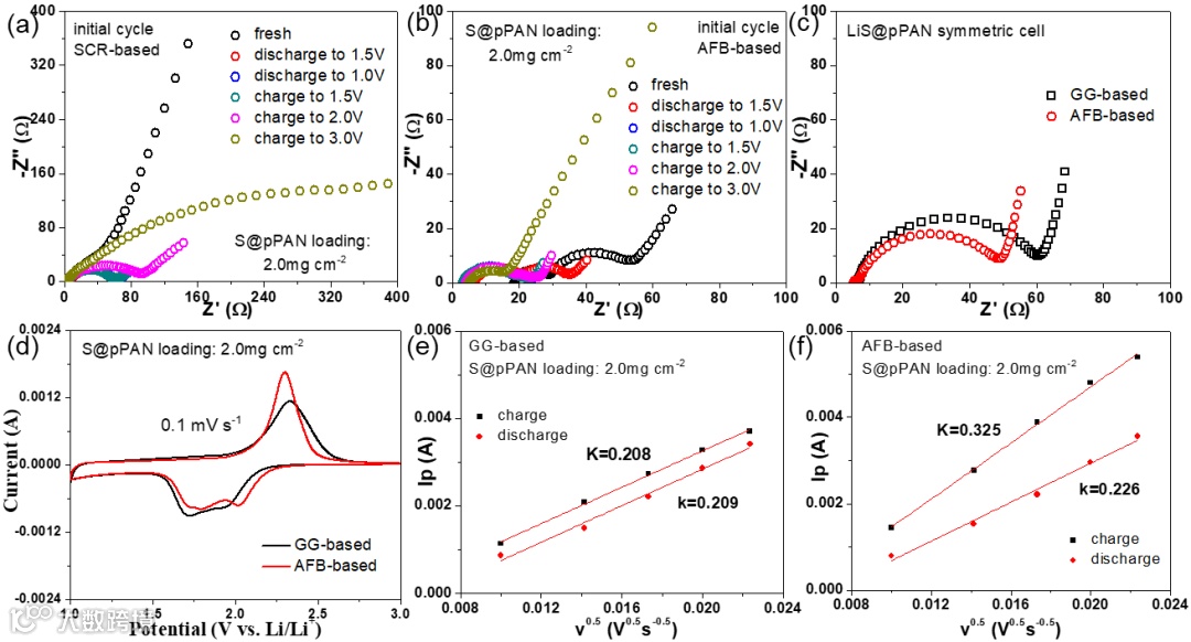 图2对比了使用不同粘结剂时的离子传输动力学。AFB基S@pPAN正极表现出更低的阻抗以及增强的锂离子扩散系数。