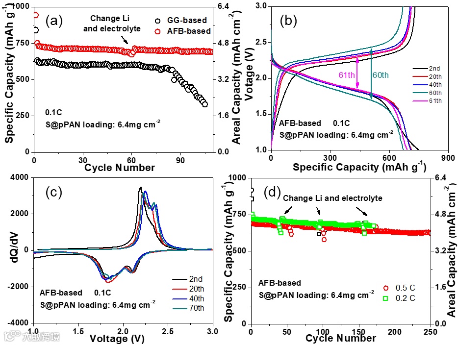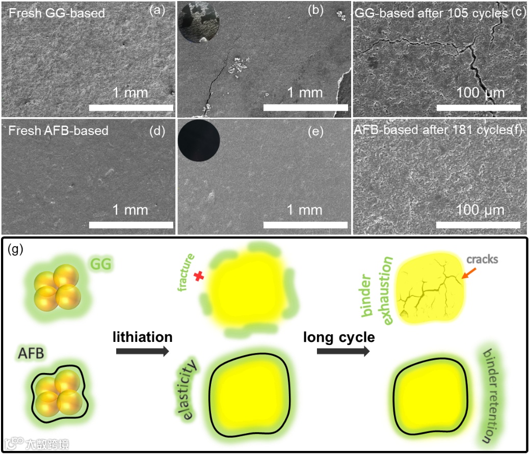 相比之下,柔性网状的AFB表现出增强的延展性可以有效容纳硫正极的体积变化,高剥离强度确保正极材料紧密粘结于集流体。因此,即使长循环后正极结构致密无裂缝,更换锂负极后,容量实现完全恢复。图4g展示了循环中不同粘结剂条件下硫正极结构变化示意图。