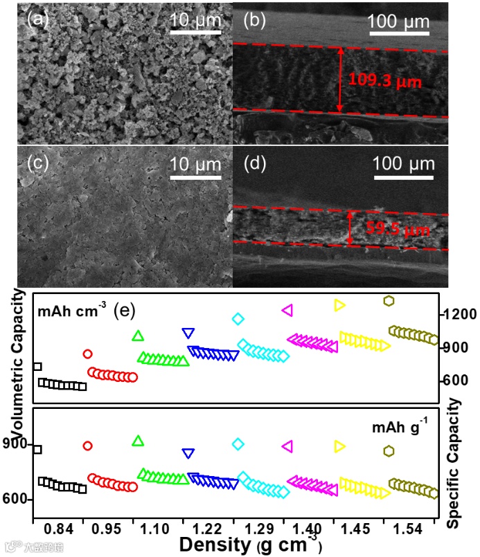 (c, d)压力处理后极片表面(c)和截面(d)SEM.