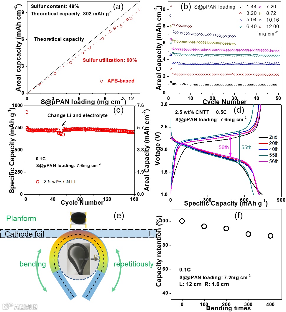 (e, f)贫液条件下高压实高载量S@pPAN正极循环稳定性(e)和充放电平台(f)。