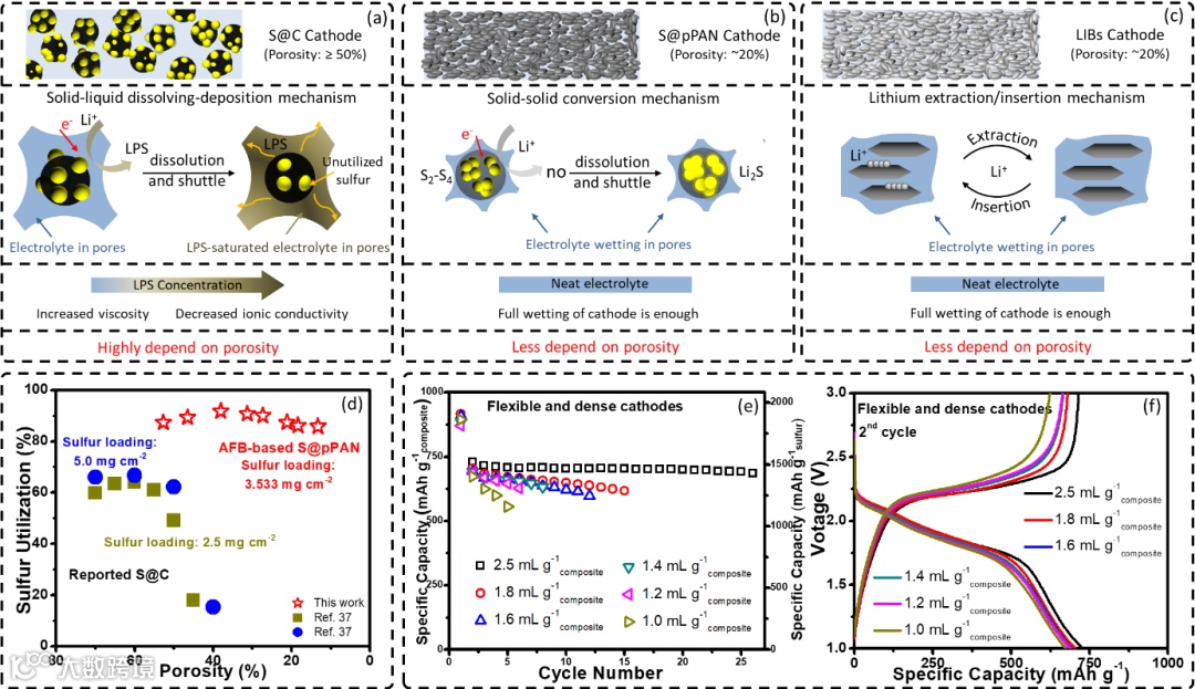 相比于普通碳硫(S@C)的固-液-固转化机制,S@pPAN正极有着独特的固-固转化机制,不存在多硫化锂的溶解和穿梭,有效提升循环稳定性和硫利用率。在低孔隙率及贫液条件下这一优势更加突出,其特性类似锂离子电池金属氧化物或磷酸盐正极材料。
