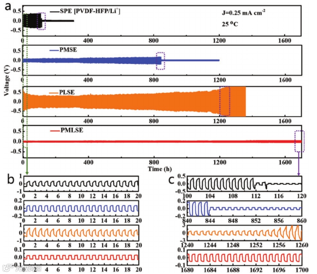 Enlarged voltage profiles of various electrolytes: b) initial and c) last 20 h.