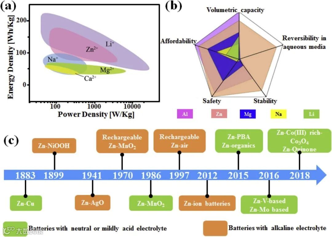 如图2(b)所示,金属Zn优于Li,Na和K的最大优点是金属Zn在水性介质中相对稳定且氧化还原可逆。尽管Mg和Al在水中也很稳定,但它们的电沉积在水性电解质中在热力学上是不可行的,因此锌可以直接用作不可燃且低成本的水性电解质中的负极。与基于Ca2+,Mg2+和Na+的电池相比,直接采用Zn金属作为电极之一可显着提高基于锌的电池的能量密度。相应的电解质系统也被标记,由此很容易得出结论,大多数锌-空气电池电解质主要是碱性的。而锌离子电池的电解质可以在碱性到接近中性和酸性条件下工作。