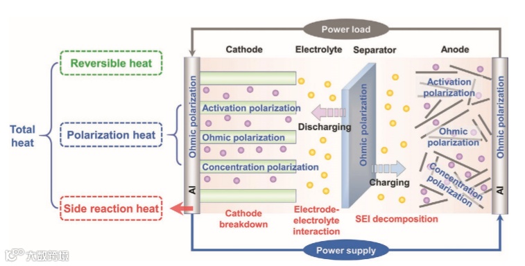 因此,从根源上抑制热产生并且加速热扩散是降低热失控发生概率的有效途径。研究表明,电池热失控过程中的两大主要热来源是极化热(Qp)和副反应热(Qs)(图2)。而极化热与工作电流以及极化电阻呈正比,因此构建构电子、离子和声子输运网络,通过优化电子和离子传输动力学可减少电池的极化热Qp,同时增强声子热导来加速快充条件下的散热速率。Qs主要与电池的材料有关,因此提高体相材料、电解质和界面的热稳定性可降低Qs。另一方面,阻燃电解质降低电池总发热量ΔH。当然,停止高温条件下的电化学行为可以有效的规避热失控,因此需要发展利用材料的物理或化学性质对于温度响应的智能型材料是来终止热失控。