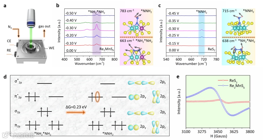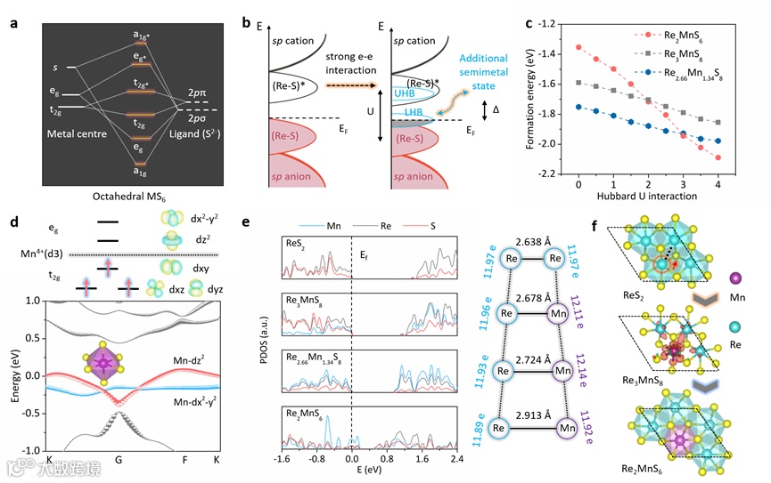 通过对Re2MnS6电子结构的理论计算,研究小组发现,当Mn原子被引入Re2MnS6中形成有序的Re2MnS6结构时,Mn-S配位与Re-s配位的Paul电负性差异将导致Re-5d和Mn-3d轨道上的电子转移,显示出半金属的特性,为载体的快速运输和反应路径的调控提供了可能。