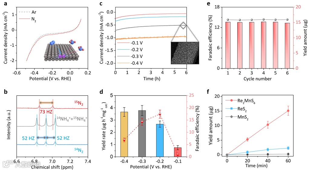 结果表明,Mn(Re2MnS6)的有序杂化可以大大提高N2制NH3的效率。如图3所示,电化学测试表明,在-0.3V(相对于可逆氢电极, RHE)和0.1M Na2SO4中,Re2MnS6具有较高的NH3产率(15.1 mg h-1),在-0.2V时法拉第效率可达17.42%,远高于ReS2(2.3 mg h-1)。同时,该催化剂具有较高的电化学稳定性,在6小时的电催化过程中其催化电流没有明显下降。