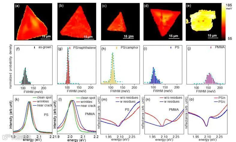 图6. PS/小分子,PS,PMMA转移样品光学性质比较。室温FWHM mapping:a)as-grown样品,b)PS/naphthalene转移样品,c)PS/camphor转移样品,d)PS转移样品,e)PMMA转移样品。f-j)不同转移方法相应的FWHM数据柱状图。纯高分子转移方法PS(k),PMMA(l)视觉干净、褶皱、破损点室温PL光谱。不同方法转移样品77K reflectance光谱: PS(视觉干净/有残留 点)(m),PMMA(视觉干净/有残留 点)(n),PS/naphthalene、 PS/camphor (o)。