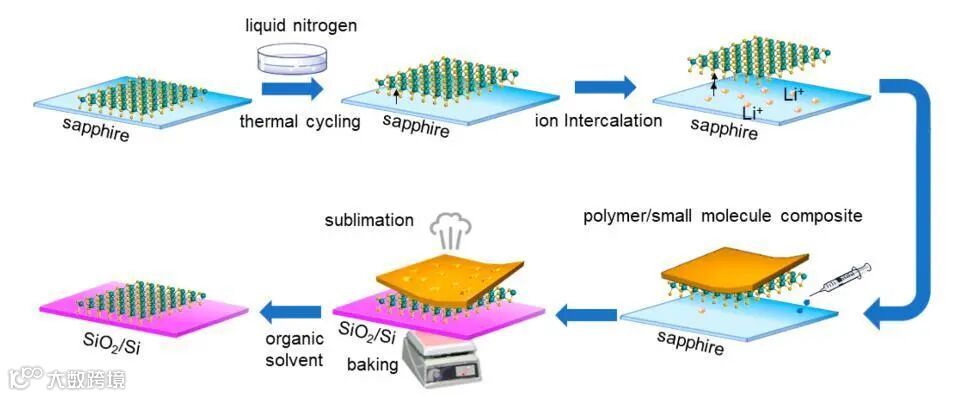 图1显示了结合了衬底脱附和高分子PS/小分子复合物转移的主要过程。与传统转移方法不同的是多了液氮降温、升温过程和Li离子嵌入的前处理过程,和利用了高分子骨架嵌入了易升华小分子的转移媒介。