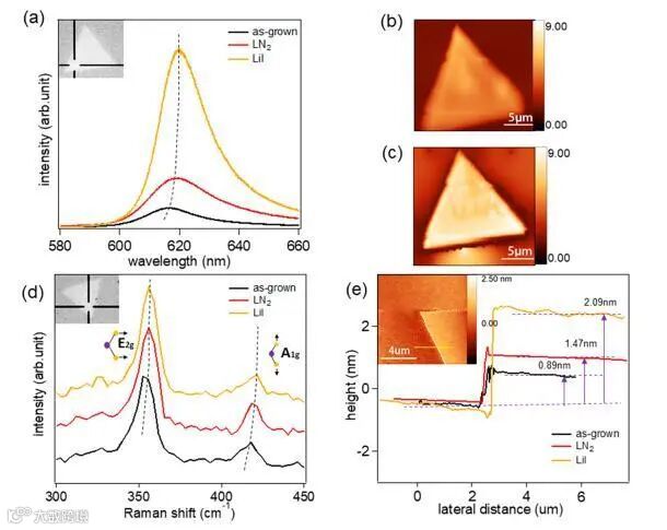 液氮降温与升温过程利用了CVD生长样品与衬底之间的热膨胀系数的差异,使得两者在边缘处有所分离,而Li离子嵌入则进一步加剧了TMD样品与衬底的分离 (Li离子具有很高的溶解度1650g/L LiI/H20,易于用去离子水去除,从而不会对样品性质产生影响)。