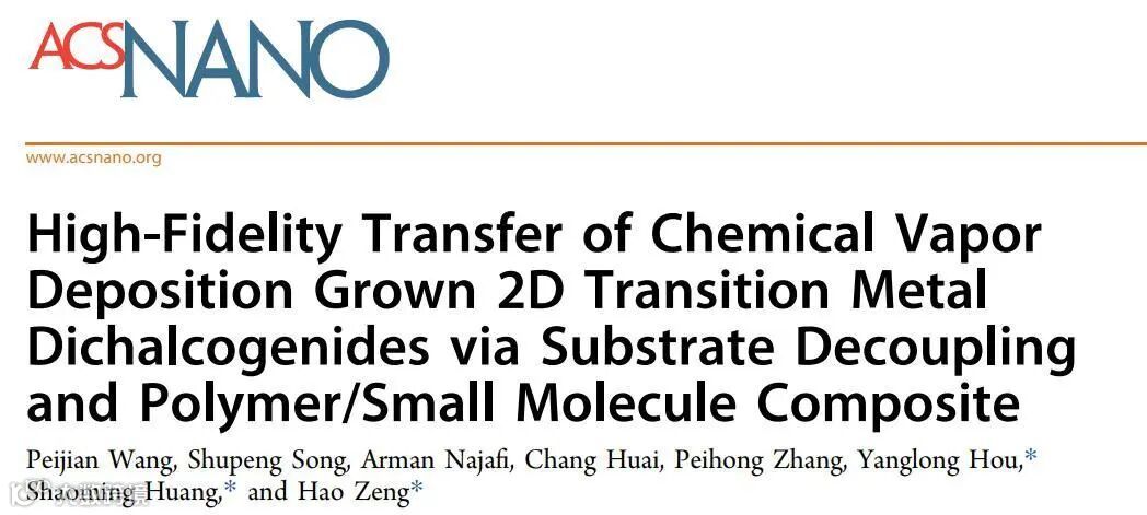 近日,广东工业大学黄少铭教授, 纽约州立大学布法罗分校曾浩教授课题组及北京大学侯仰龙教授在国际材料顶级期刊ACS nano (2018影响因子:13.9)上发表题为“High-Fidelity Transfer of Chemical Vapor Deposition Grown 2D Transition Metal Dichalcogenides via Substrate Decoupling and Polymer/Small Molecule Composite”的研究工作。