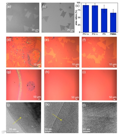 图5. 高分子/小分子复合物转移和纯高分子转移效果比较。a,b)PS/naphthalene转移前后样品显微图片。c) 不同转移方法面积比柱状图。PS转移样品(d), PS/naphthalene转移样品(e),PS/camphor转移样品 (f) 在浸泡1.5h后显微图片。PS薄膜/Si衬底(g),PS/naphthalene薄膜/Si衬底(h), PS/camphor薄膜/Si衬底(i)在浸泡1.5h后显微图片。转移WS2样品TEM图片:PS(j),PS/naphthalene(k),PS/camphor(l)。