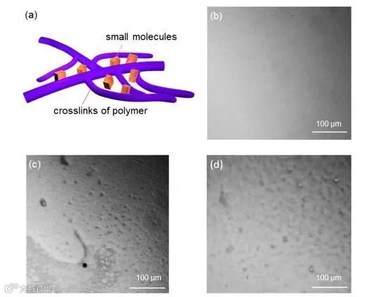 图4. 高分子掺杂小分子转移薄膜显微图片。a) 高分子骨架掺杂小分子示意图。加热(baking)后薄膜表面光学显微图片:PS (b),PS/naphthalene (c), PS/camphor (d)。