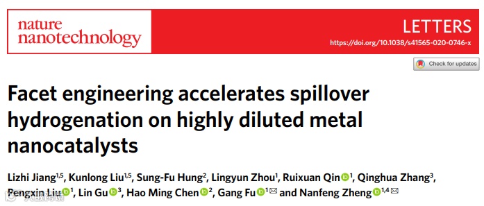近日,厦门大学郑南峰教授.傅钢教授课题组在国际顶级期刊Nature Nanotechnology (影响因子:31.538) 上发表题为“Facet engineering accelerates spillover hydrogenation on highly diluted metal nanocatalysts”的研究工作。