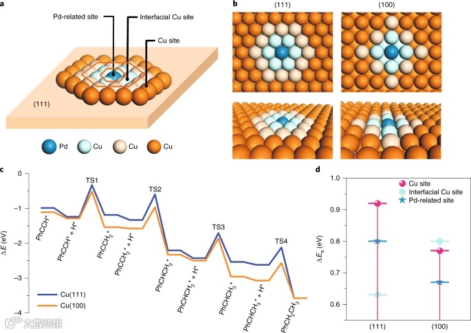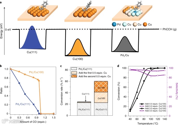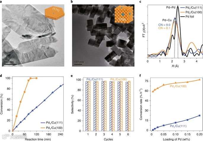 本文证明了溢流加氢具有很强的载体晶面依赖性。当以Cu纳米立方块为载体时,暴露的Cu(100)面可在痕量(ppm级)Pd存在下,对炔烃半氢化反应具有很高的活性和选择性;而同样条件下,以暴露Cu(111)面的Cu纳米片为载体,几乎不具有加氢活性。