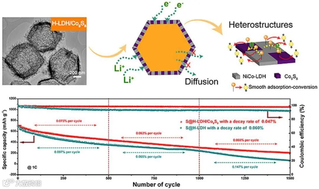 为了解决上述问题,合理设计多功能LSB正极作为硫主体和LiPSs介体非常重要。极性的过渡金属(例如钴),金属氮化物(例如氮化钛和Co4N),金属硫化物(例如Co9S8和SnS2),以及作为层状双氢氧化物(例如,NiCo-LDH和NiFe-LDH)已被证明是有效的多功能LSB正极,可同时捕获LiPS和促进LiPSs转化动力学。然而,极性位点的简单结合仍然显示出有限的活性位点和差的电导率,从而有效地避免了LiPS从电活性介体的表面逸出并导致寿命延长期间容量迅速下降。为了补救这个问题,剪裁和构造以及安排和多组分异质结构可能使更多的活性位点和增强导电性,从而提高硫的利用率和减轻的能力在长充电-放电循环衰落。例如,Yang等构造了孪生的TiO2–TiN,通过控制将加入尿素的Ti4+比例,TiO2的强吸附LIPSS能力与高度导电的TiN组合已在液-固界面实现平稳LIPSS的俘获和扩散转换。将这种异质结构作为物理阻挡层并入石墨烯后,在2000个充电/放电循环中,电极可实现73%的出色容量保持率。