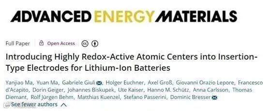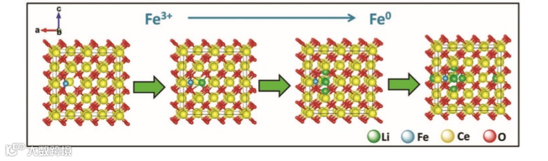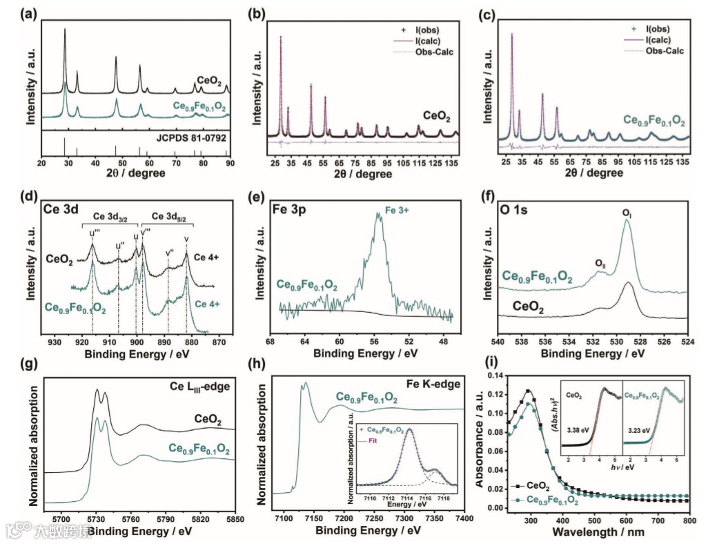 基于以上背景,德国HIU和KIT的Dominic Bresser和卡梅里诺大学的Gabriele Giuli等人在国际知名期刊Advanced Energy Materials上发表题为“Introducing Highly Redox-Active Atomic Centers into Insertion-Type Electrodes for Lithium-Ion Batteries”的文章。本文第一作者是Yanjiao Ma。在作者的研究中,作者表明,在CeO2晶体结构中占据偏离中心位置的选定金属掺杂剂(例如铁掺杂剂)的引入可使容量显著增加200%以上。这种改进的关键在于在不影响晶体主体结构的情况下,将掺杂原子还原为金属状态。掺铁CeO2负电极与高压LiNi0.5Mn1.5O4正电极耦合提供高功率LIBs,具有良好的循环稳定性,重量能和功率密度分别高达200wh kg-1和8500w kg-1。图1. 材料结构表征。a) X-ray diffraction (XRD) patterns of CeO2 (in black) and Fe-doped CeO2 (Ce0.9Fe0.1O2, in cyan); the JCPDS card No. 81–0792 of the fluorite cubic structure is given as reference in the bottom; b−c) Rietveld refined diffractograms of (b) CeO2 and (c) Ce0.9Fe0.1O2;d−f) X-ray photoelectron spectroscopy (XPS) analysis of pure CeO2 and Ce0.9Fe0.1O2. d) Comparison of the Ce 3d spectra for both samples. e) Fe 3p spectra for Ce0.9Fe0.1O2, and comparison of the O 1s spectra for both samples (f).g−h) Normalized X-ray absorption spectroscopy (XAS) spectra collected at the (g) Ce LIII edge for both samples and (h) Fe K edge for Ce0.9Fe0.1O2 (inset: background-subtracted Fe pre-edge peak).i) Ultraviolet-visible (UV−vis) absorption spectra for pure CeO2 and Ce0.9Fe0.1O2; as inset the corresponding plots for the determination of the band gap..文章链接:https://onlinelibrary.wiley.com/doi/10.1002/aenm.202000783
