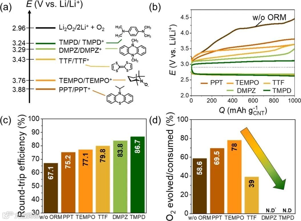 (a)被测ORM的氧化还原电位和分子结构。(b)包含0.2 M ORM(或不包含ORM)和1.0 M LiTFSI / TEGDME 的Li–O 2电池的恒电流电位分布,电流密度为100 mA g –1 CNT(相当于0.12 mA)。(c,d)对应于(c)往返能量效率和(d)从OEMS测量获得的O2释放/消耗比率。ND *表示不确定。